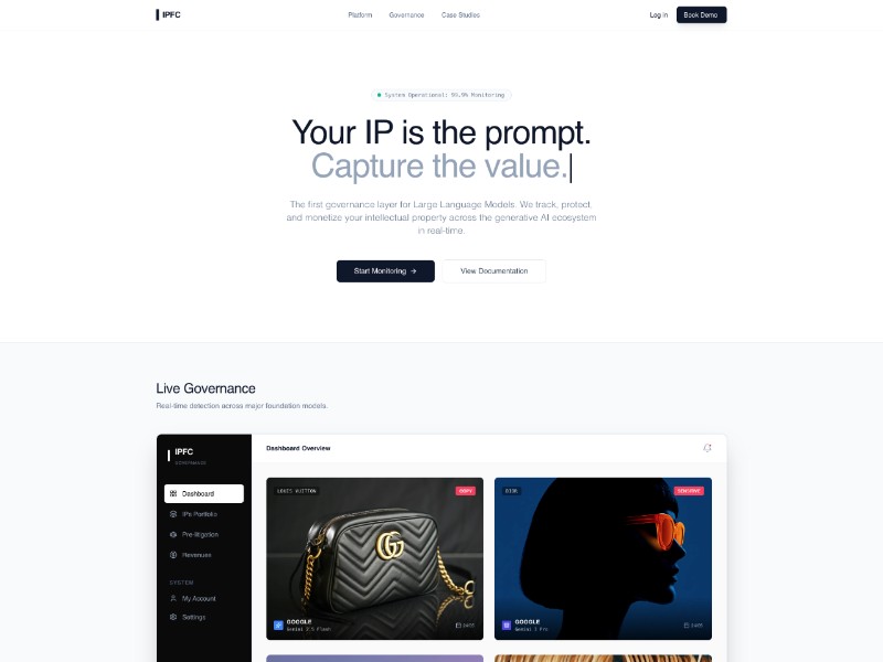 A polished, product-first template for platforms that track, protect, and monetize intellectual property across the generative AI ecosystem.