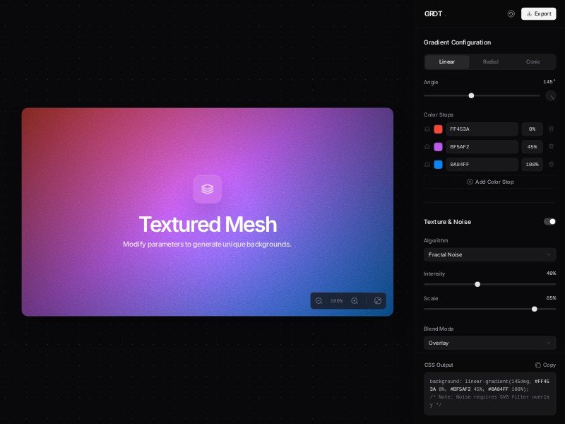 A reusable dark UI template for building gradient and texture generator tools with live preview, adjustable controls, and export-ready CSS output.