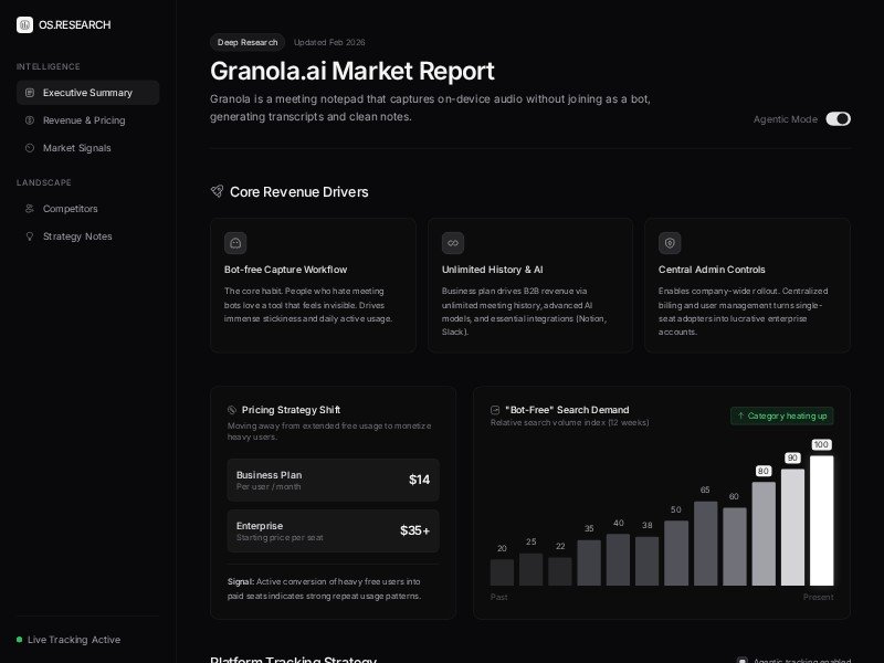 OS.Research AI Market Research Dashboard Template is a sleek, dark-mode interface for showcasing deep product reports, pricing insights, and competitive landscapes.