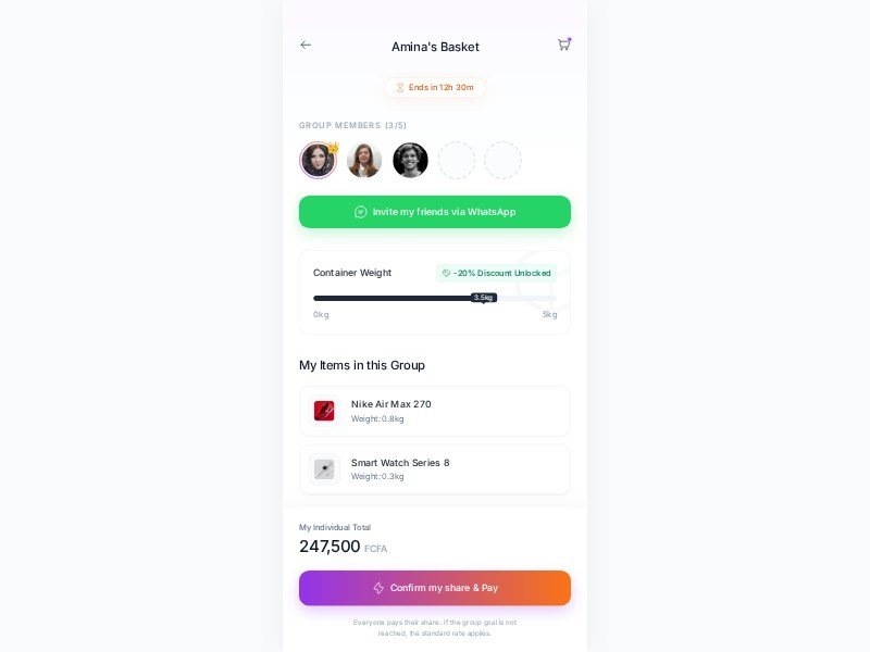 A polished mobile e-commerce template designed for group purchases, shared carts, and social checkout experiences. Ideal for brands building collaborative shopping or savings-based commerce flows.