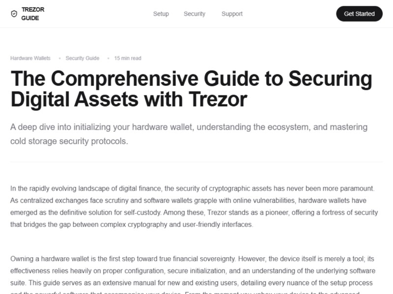 Crypto Security Guide Landing Page Template is a content-first layout designed for in-depth hardware wallet setup and security instructions, modeled on a Trezor-style guide.