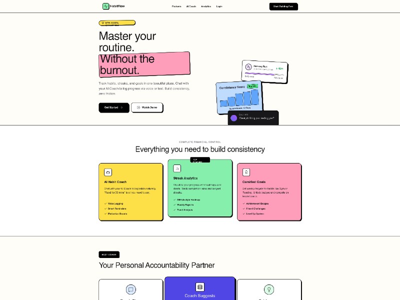 A bold, neo-brutalist landing page template for a smart habit tracking and AI coaching app, ready to customize for your own productivity product.