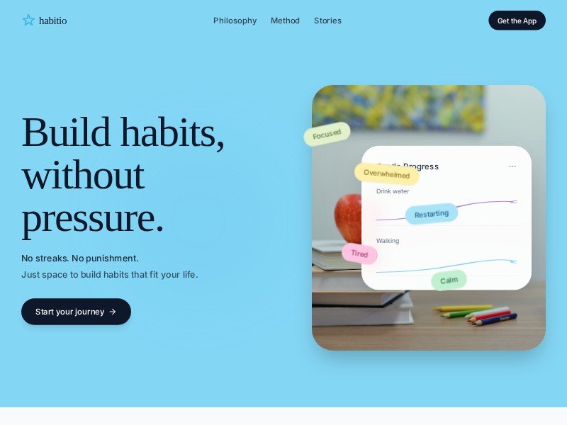 habitio is a serene and sophisticated landing page template crafted for wellness apps that prioritize mental well-being over rigid streaks. It features a soft, pastel-driven aesthetic using Tailwind CSS and Playfair Display typography for a premium, calming feel.