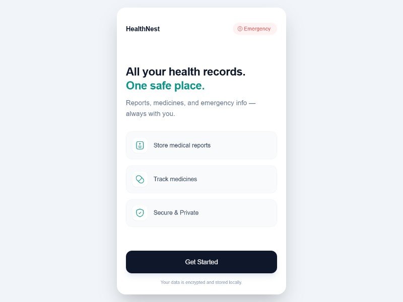 A clean, mobile-first HealthNest app UI template for managing health records, medicines, visits, and emergency info in one secure interface.
