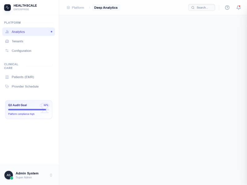 A reusable HealthScale-inspired analytics dashboard template for healthcare platforms, featuring multi-tenant management, clinical insights, and system monitoring UI.