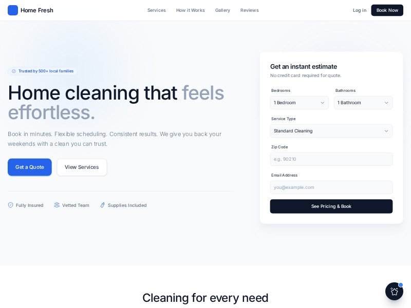 A polished, conversion-focused template for home cleaning businesses that want to showcase services and streamline online bookings.