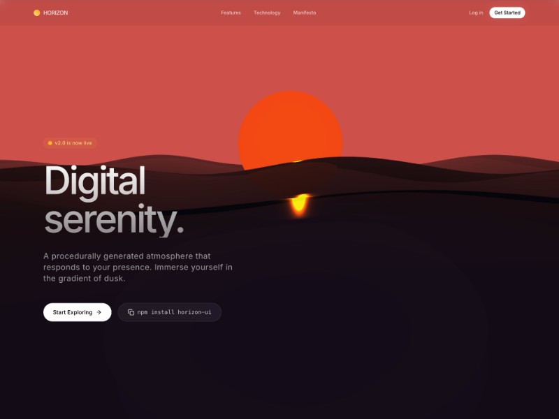 Horizon is a dark, immersive landing page template designed for WebGL, 3D, or developer tools brands.
