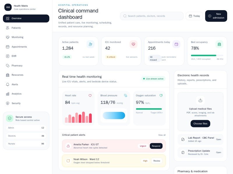 A reusable hospital management dashboard template for monitoring patients, appointments, records, pharmacy, alerts, and care operations in one interface.