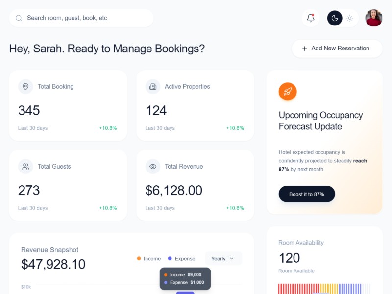 A modern hotel booking dashboard UI template for managing reservations, revenue, room availability, and transactions in one clean, responsive interface.