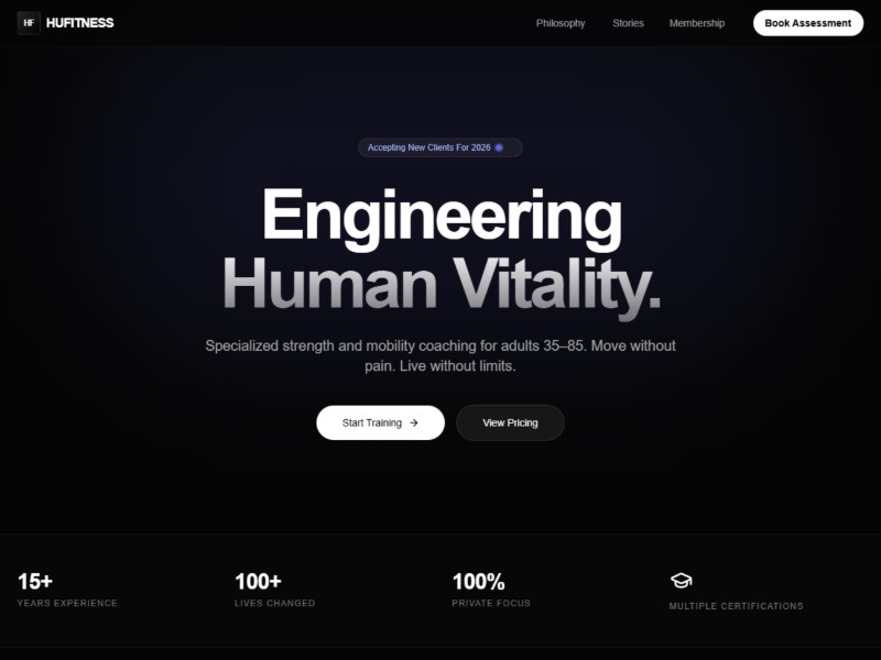 A modern HuFitness-inspired landing page template for premium longevity and strength coaching services, ready to customize for personal trainers and gyms.