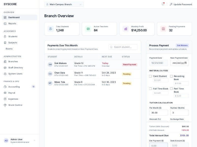 Perfect for private schools, language centers, and universities looking to build a custom backend for student administration and financial operations.