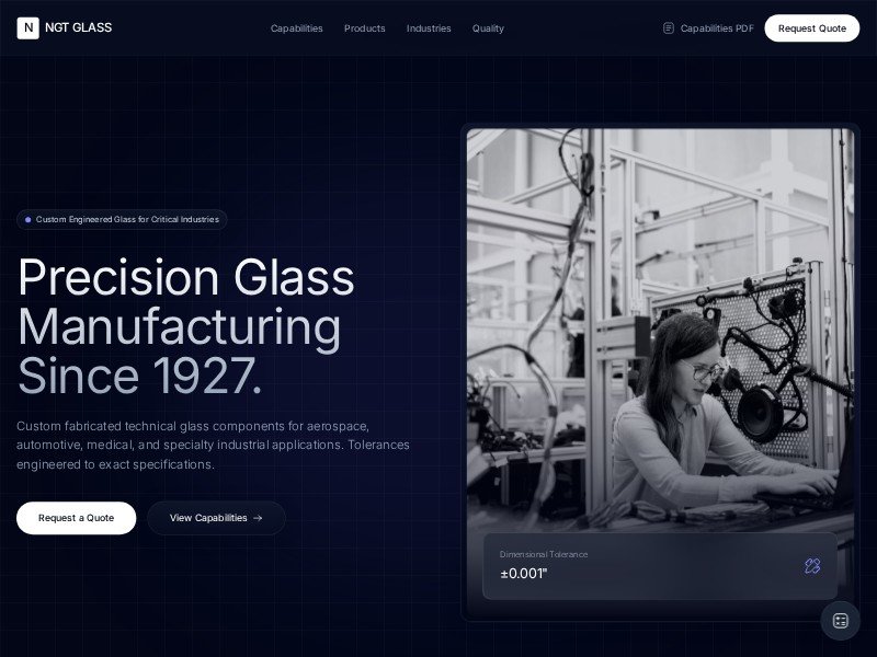 This premium landing page template is tailored for high-tech manufacturing and engineering services. It features a sophisticated dark-mode UI with high-contrast elements, perfect for showcasing technical specifications and industrial hardware.