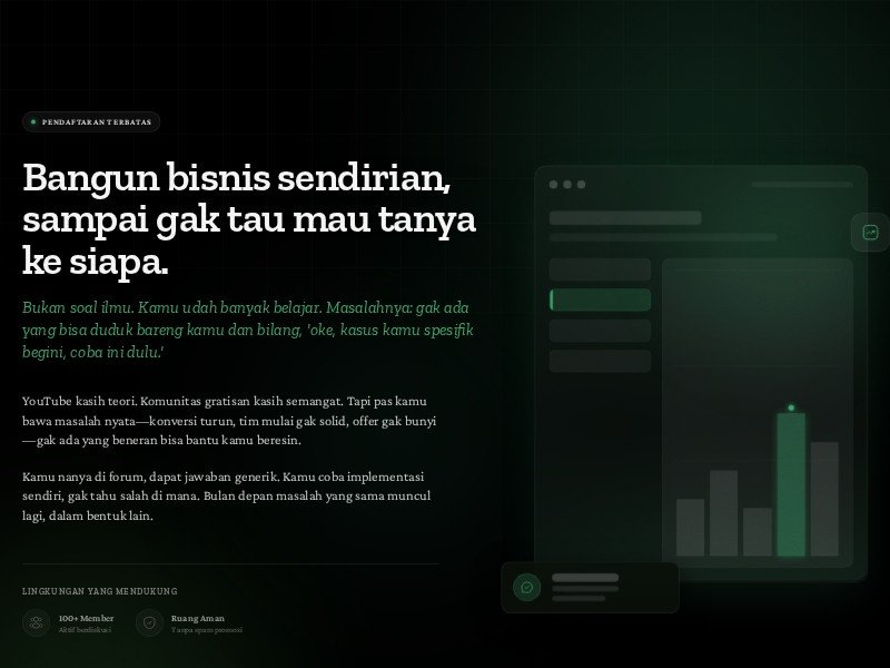 A high-conversion landing page template designed for premium communities and business mastermind groups focusing on serious online entrepreneurs.