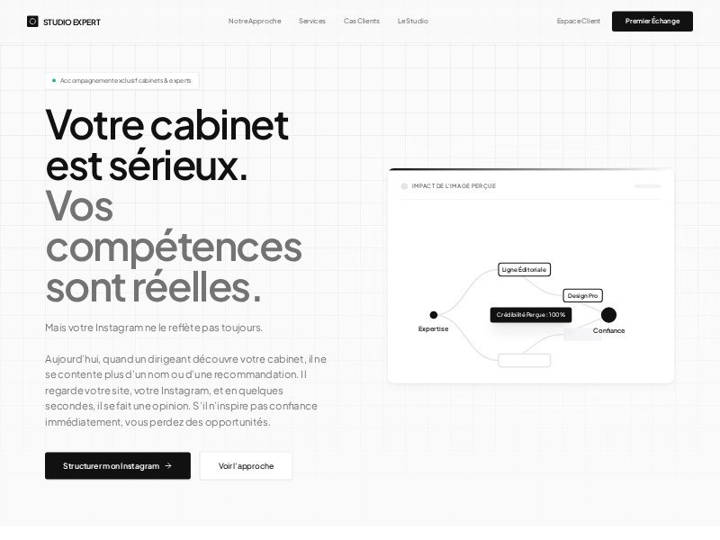 Studio Expert Landing Page Template is a refined, French-language single-page layout for agencies that build credible Instagram presences for accounting firms.