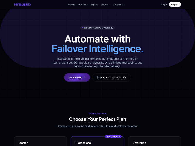 A reusable dark-mode IntelliSend landing page template for marketing an AI-powered SMS failover gateway, pricing plans, and developer-focused API integration.