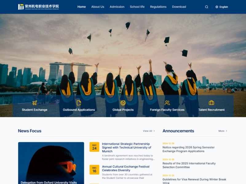 This template helps academic institutions present a credible, brand-consistent online presence with clear navigation, prominent news, and essential resources for international stakeholders.