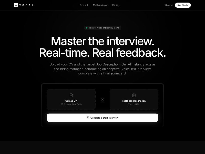 A sleek, dark-mode landing page template for showcasing an AI-driven, voice-based mock interview product.