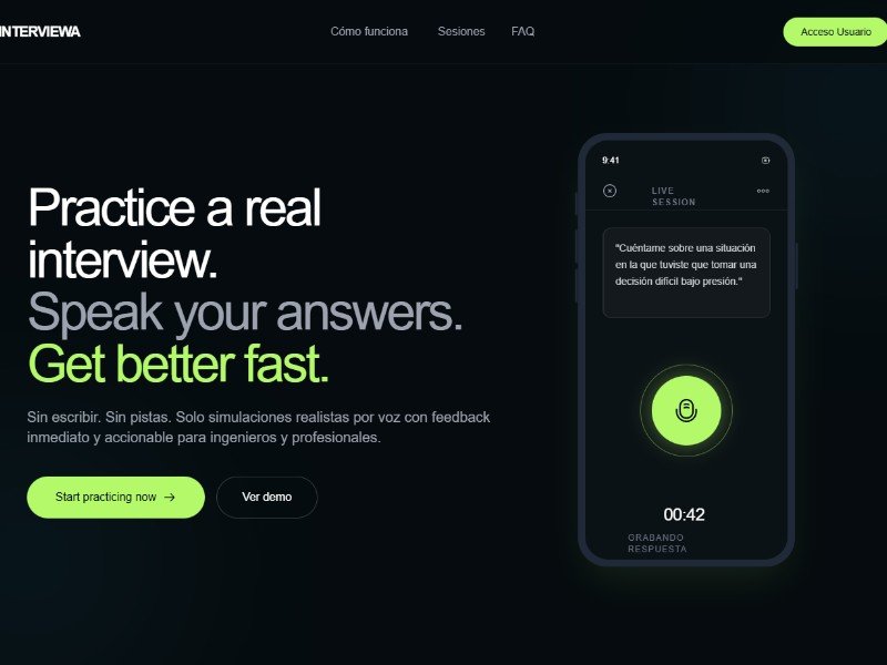 A modern Interviewa-themed landing page template for AI-powered voice interview practice apps, perfect for showcasing sessions, pricing, and conversion-focused CTAs.