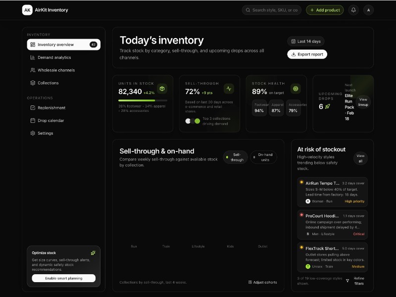 - Hero overview of units in stock, sell-through, stock health, and upcoming drops