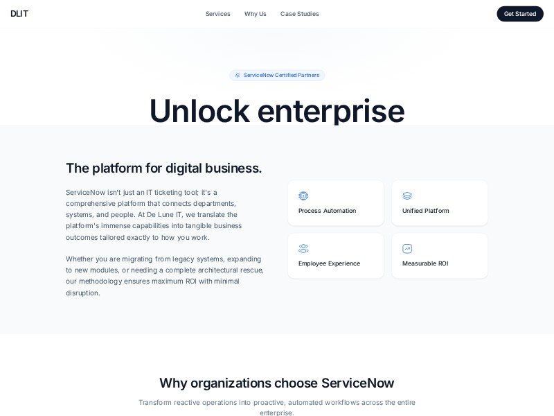Primary use case: promoting enterprise technology services and capturing qualified leads from organizations seeking workflow optimization and platform implementation support.