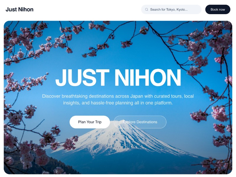 A modern Just Nihon travel landing page template for showcasing Japan destinations, tour packages, and bookings with a bold hero and curated sections.