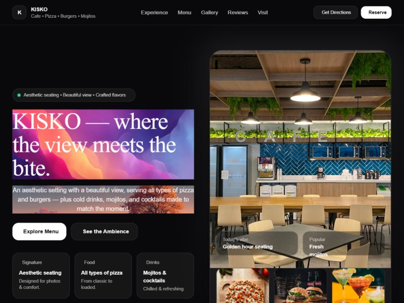 KISKO Cafe Restaurant Landing Page Template is a premium dark-mode website layout designed for aesthetic cafes, pizza spots, and cocktail bars.