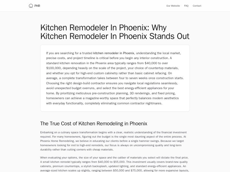 A reusable landing page template for kitchen remodeling companies to showcase design-build expertise, pricing guidance, FAQs, and local service credibility.