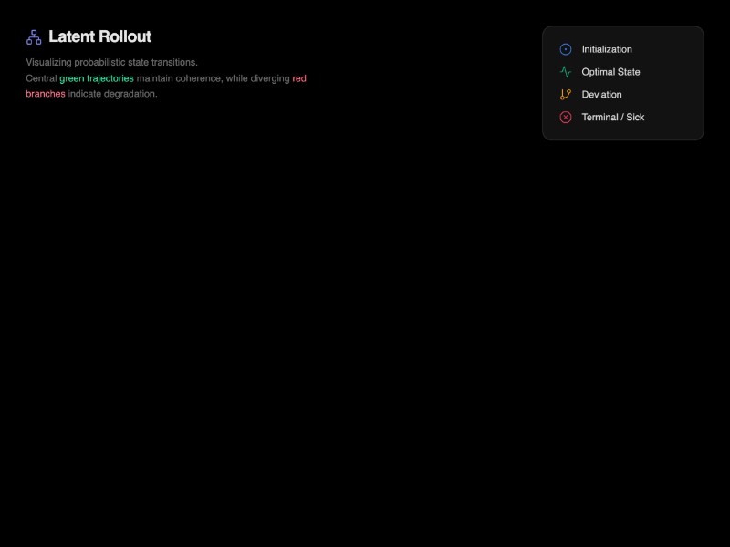 Latent Rollout is a dark, futuristic visualization template for mapping probabilistic state transitions in latent space.