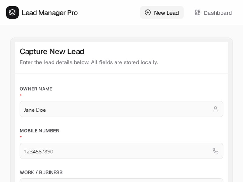 A clean Lead Manager Pro template for capturing, storing, and reviewing sales leads locally in a modern web app interface.