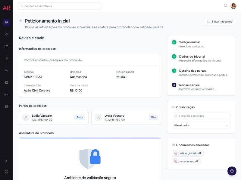 A reusable dashboard template for legal petition filing, digital signature validation, and secure case review workflows.