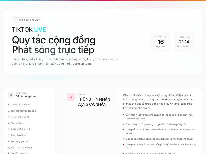 A polished documentation template for organizing live-stream policies, community standards, and internal compliance rules. Designed for teams that need a readable, structured page for publishing safety and moderation guidance.