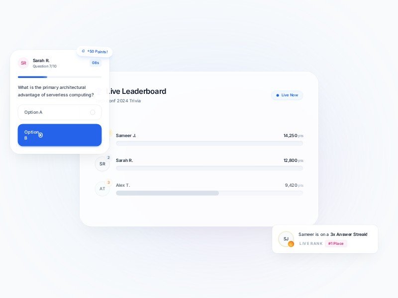 A polished template designed to present live trivia, leaderboard updates, and competitive event experiences for conferences, meetups, and branded activations.