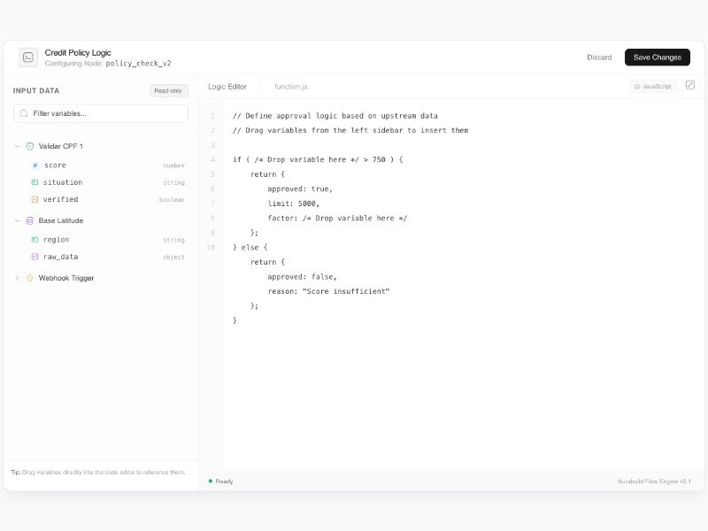 This template showcases a modern logic editor panel with a draggable variable tree, inline JavaScript editor, and status footer—ideal for internal tools and flow engines.