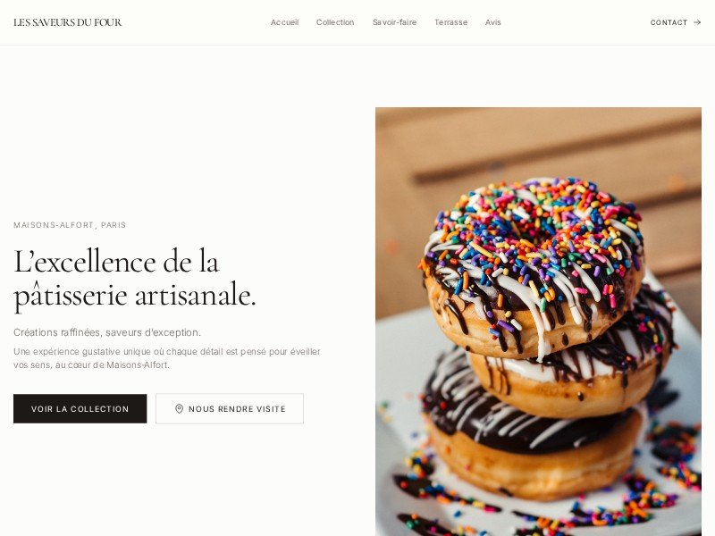 A sophisticated landing page template designed for artisan bakeries, pâtisseries, and premium food brands that want to highlight craftsmanship, signature products, and a boutique in-store experience.