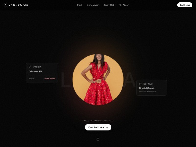 A dark, editorial fashion landing page template for showcasing luxury couture collections, lookbooks, and atelier details with immersive 3D visuals.