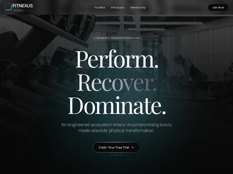 High-end fitness studio landing page template for premium gyms and wellness clubs to showcase facilities, philosophy, memberships, and drive free trial signups.