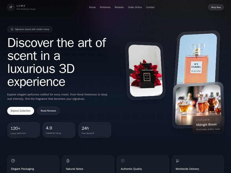 This LUMA template is a high-performance landing page designed for luxury fragrance and beauty brands. It features a sophisticated dark-themed aesthetic with 3D-inspired layout elements that create a premium feel for high-end product showcasing.