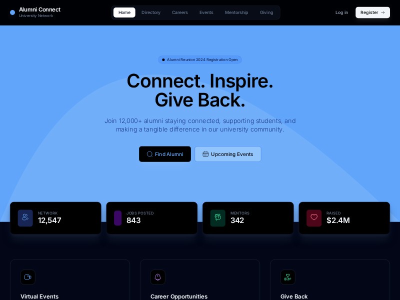 A modern Alumni Connect landing page template for universities to showcase directories, careers, events, mentorship, and giving in one unified hub.