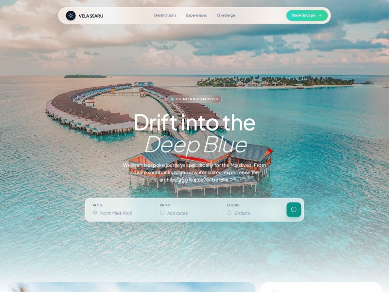 - Hero with bold imagery and glassmorphism search bar (atoll, dates, guests)