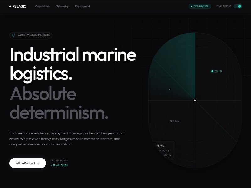 A bold, cinematic landing page template for marine logistics, offshore transport, and fleet service providers. It combines a high-tech visual style with trust-building operational content.