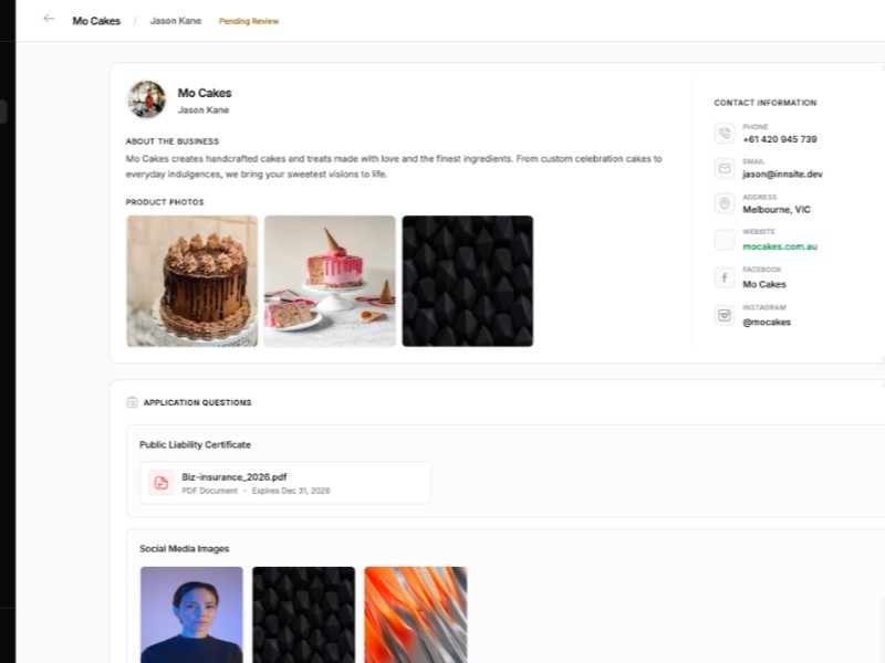 A clean, modern admin UI for reviewing and processing local market stall booking requests.