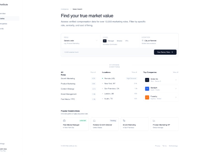 A modern, data-forward UI template for building marketing salary intelligence and compensation search tools.