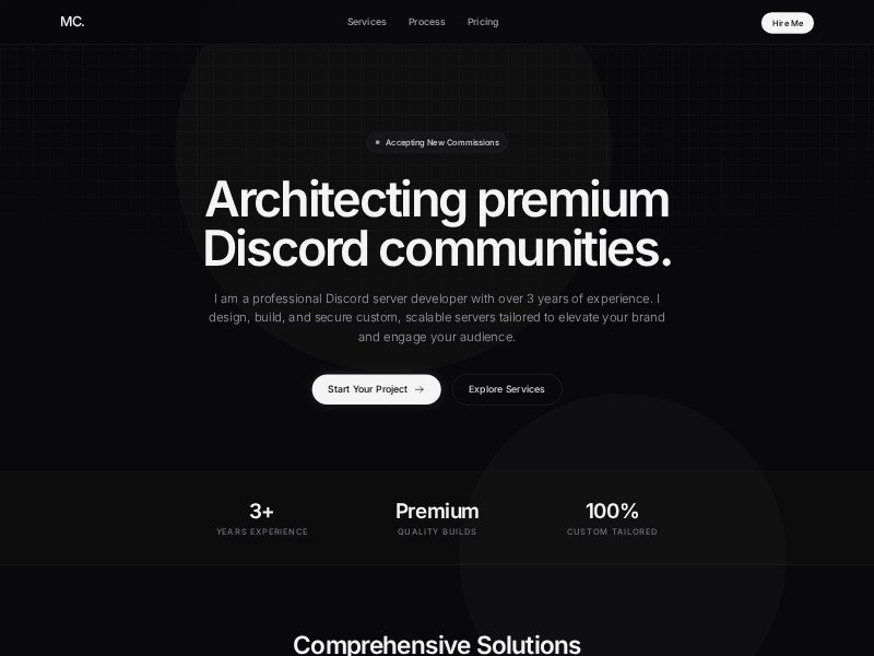 A sleek, dark-themed landing page template built for Discord server developers, consultants, and community setup specialists who want to present services clearly and convert inquiries.