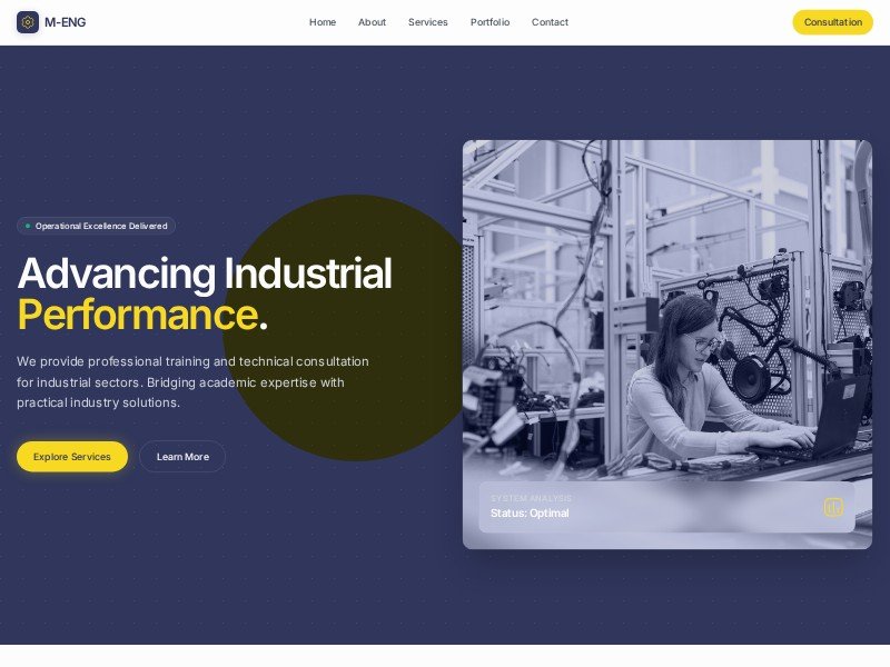 A professional landing page template for mechanical engineering firms offering industrial training, technical consultation, assessments, and project showcases.