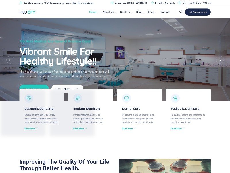 A modern Medcity medical healthcare landing page template for clinics, hospitals, and dental practices to showcase services, doctors, and online appointment booking.
