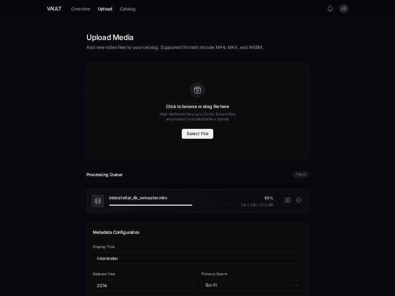 Vault Video Upload Dashboard Template delivers a sleek dark-mode interface for managing high-volume media uploads.