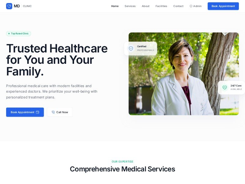 A modern, patient-focused medical clinic landing page template featuring services, doctor profile, facilities, testimonials, booking form, contact details, and admin view.