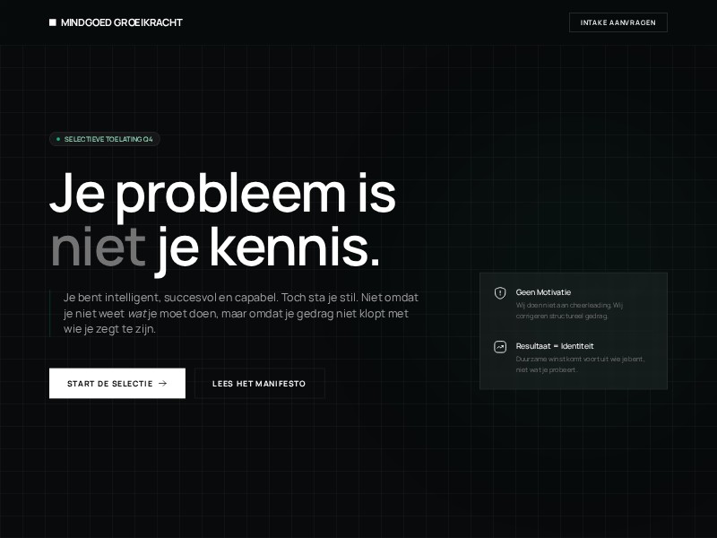 - Hero met scherpe positionering en dubbele CTA (selectie starten & manifesto lezen)