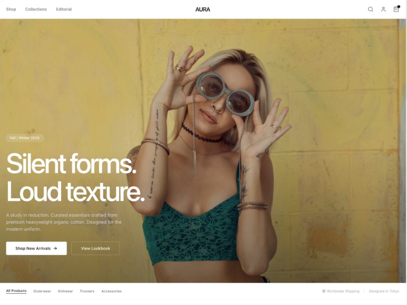 Minimalist AURA-inspired fashion e-commerce landing page template for showcasing curated apparel collections, product grids, and brand storytelling.