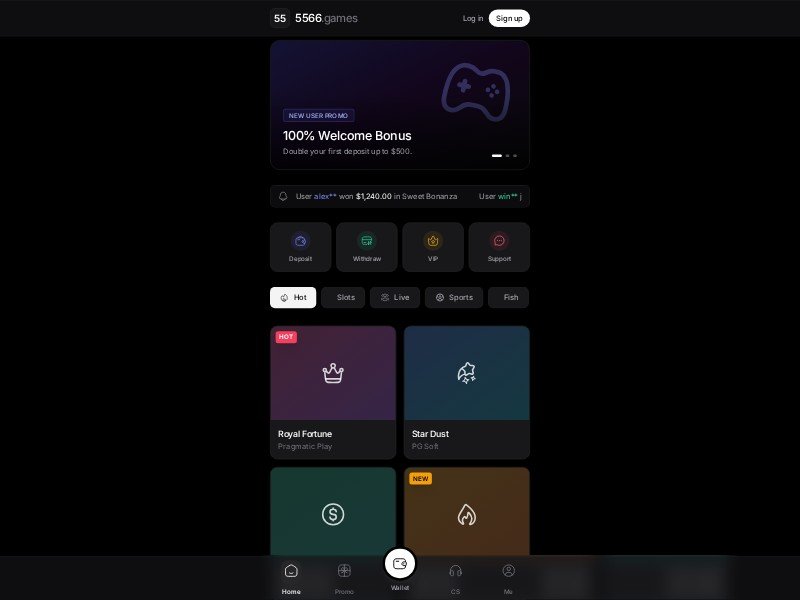5566 Games is a dark, mobile-first casino gaming landing page template built to highlight promos, hot games, and wallet actions in a sleek interface.
